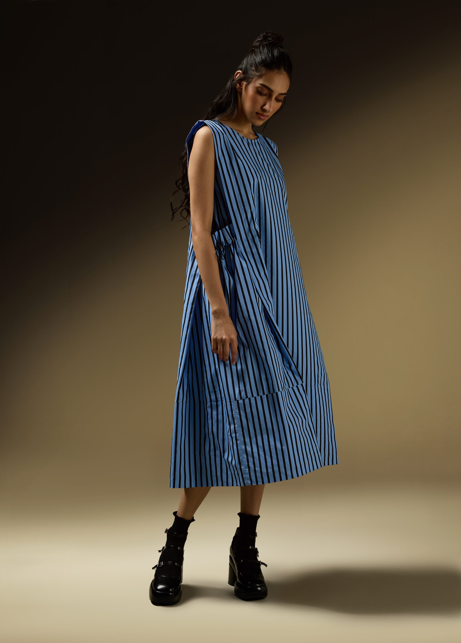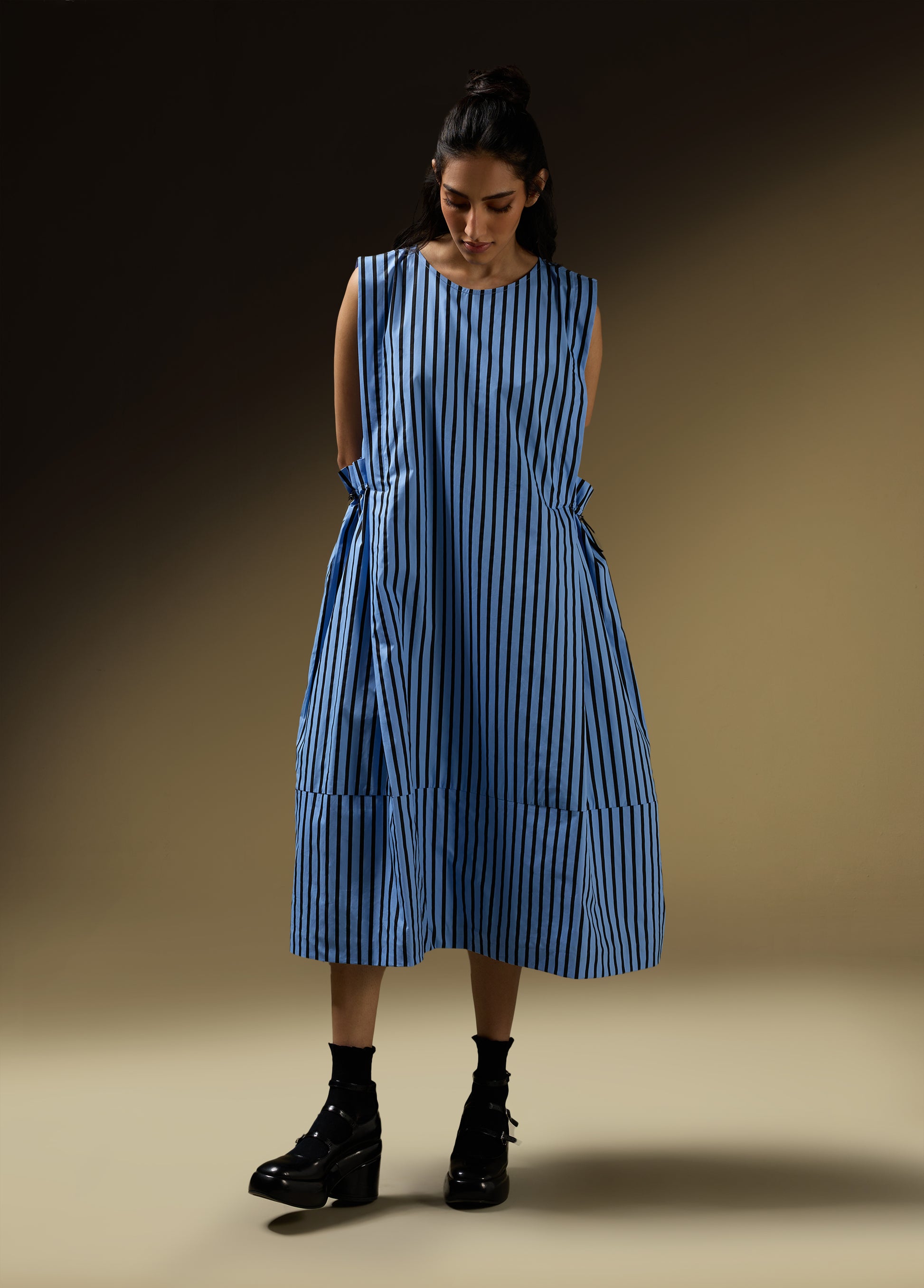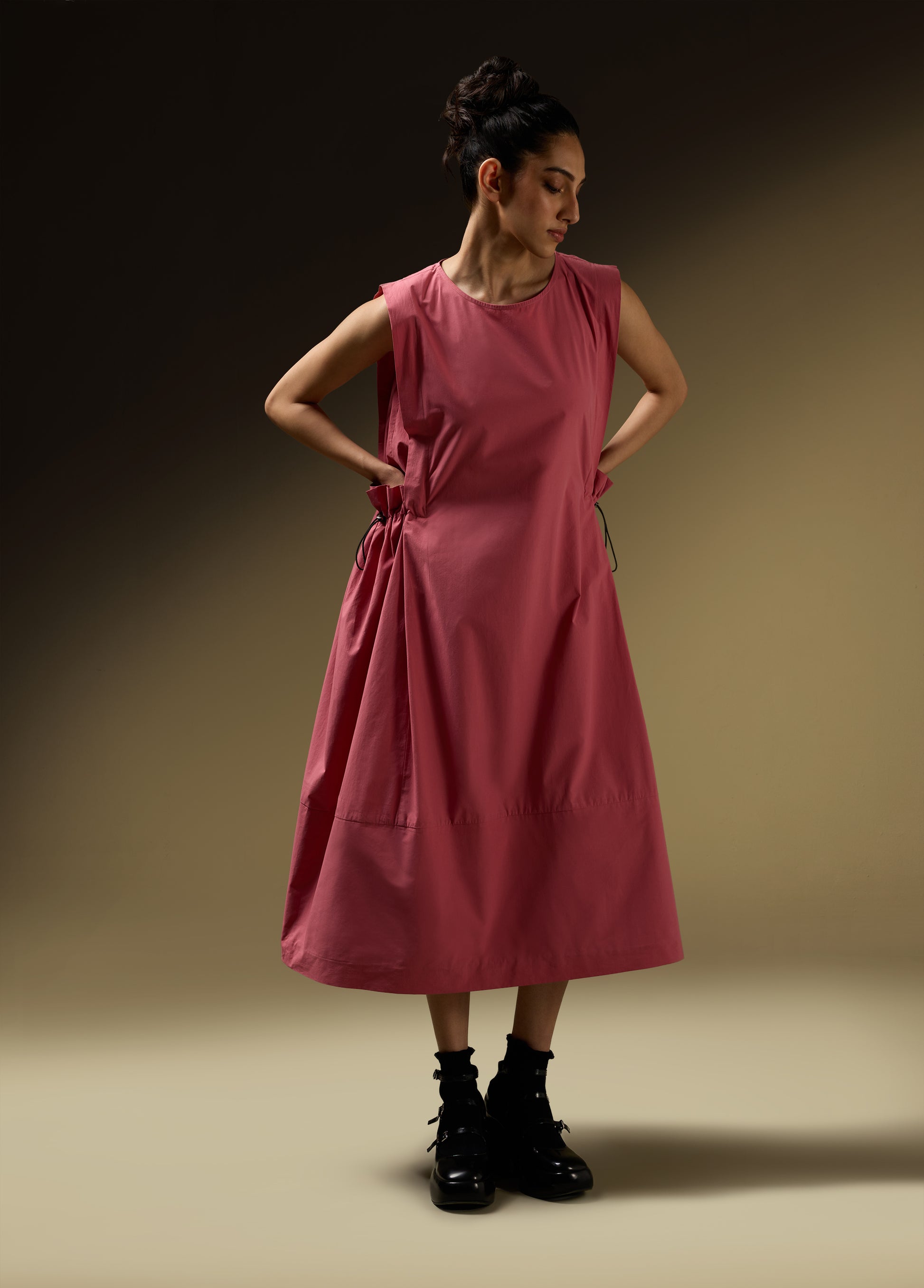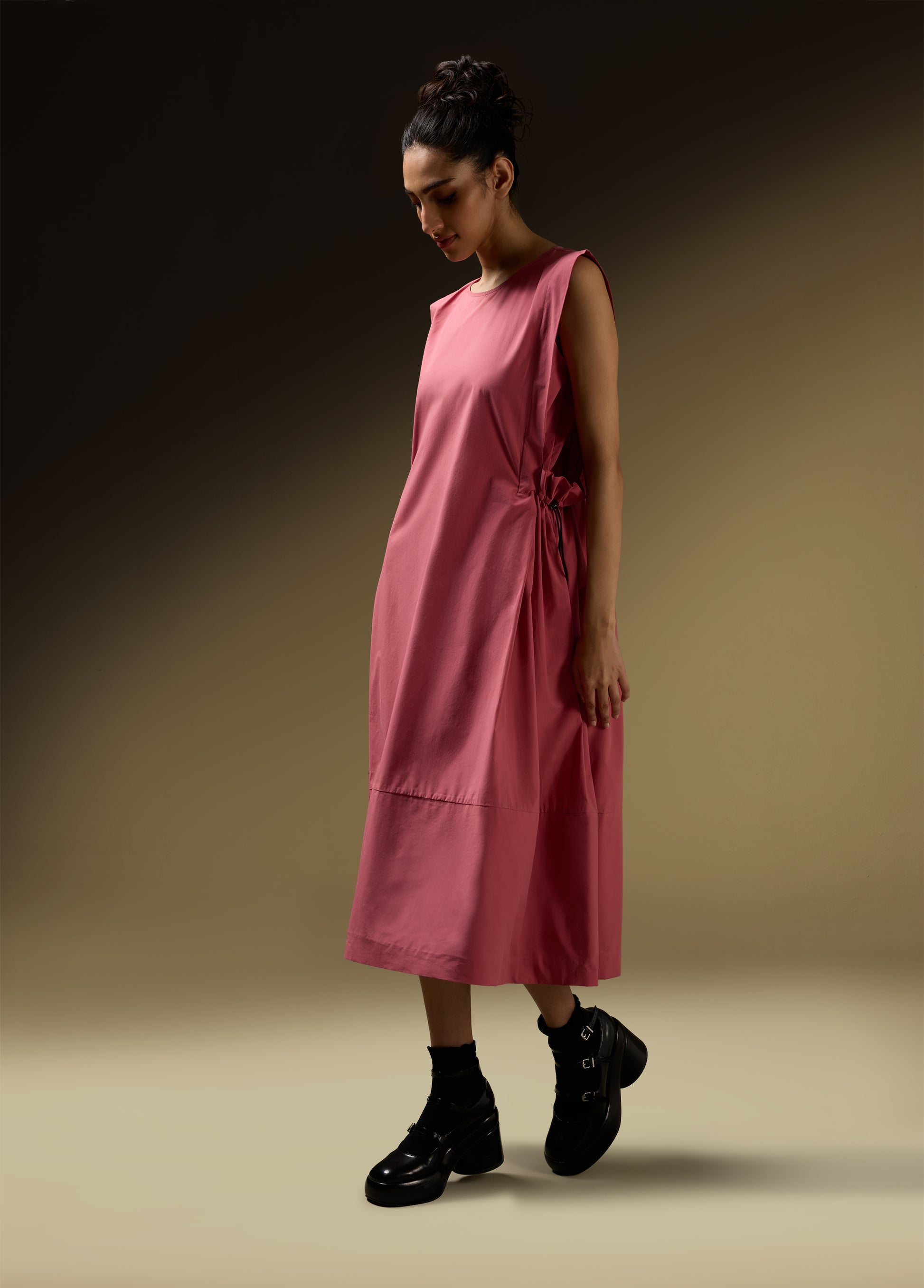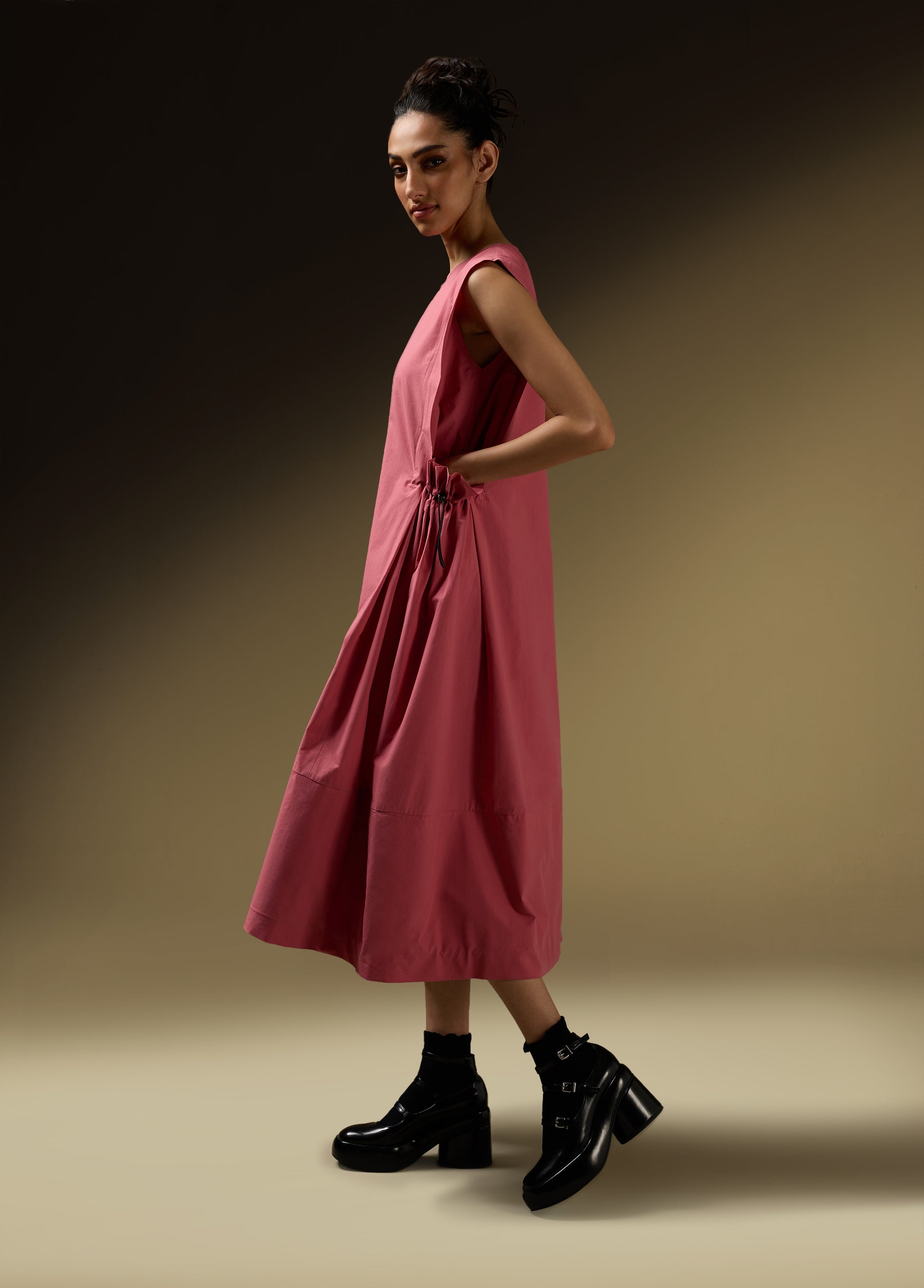 Product Details: - SLEEVELESS DRESS WITH SHOULDER PANEL AND ROUCHE POCKET DETAIL